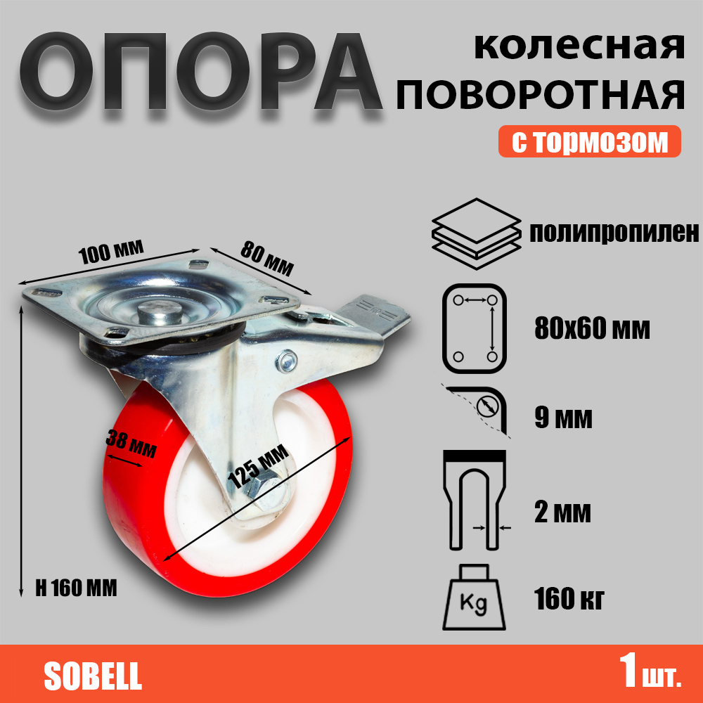 Опора колесная поворотная с тормозом ф125 мм, нагрузка 160 кг, полипропилен (SNPb 55)