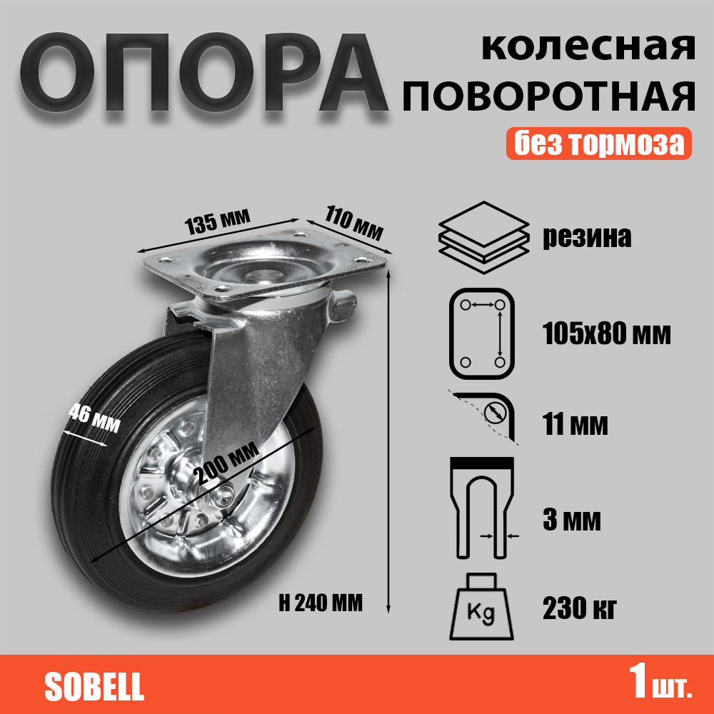Опора колесная поворотная ф200 мм, нагрузка 230 кг, резина (SRC 80)